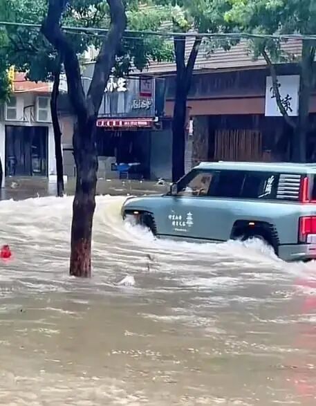 现场视频显示,越野车所经之处激起的水浪重重撞击路边商铺,有店铺的卷闸门也被水冲至变形。视频里还可清晰听到玻璃破碎的声音。后来几人将车辆拦下,指责司机“在那摇来摇去三次了。”