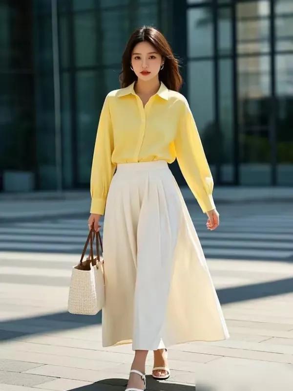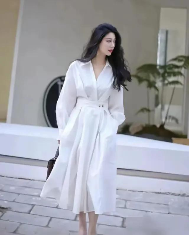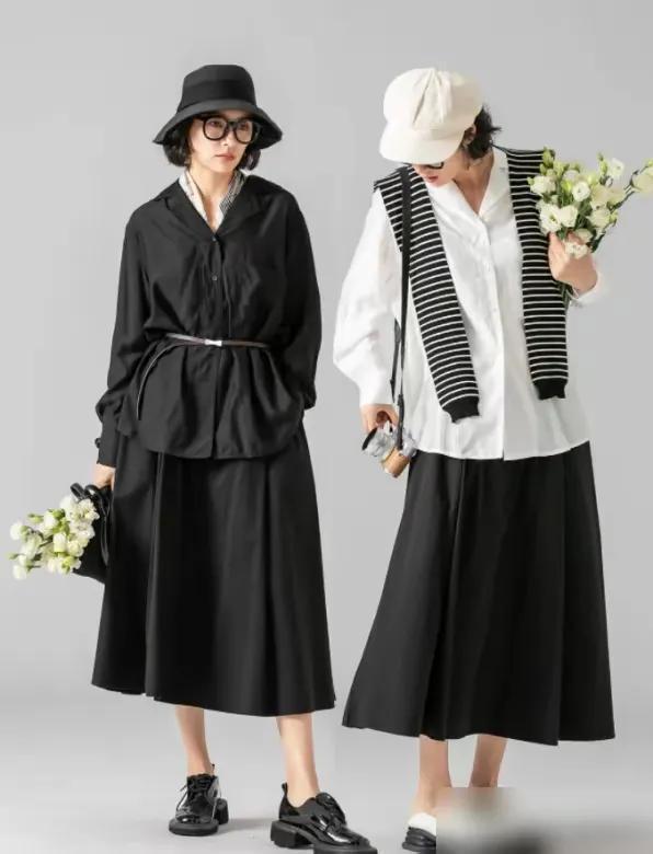 不过正常情况下来说,更推荐大家选择伞状半身裙a字半身裙,还有小宽松的直筒半身裙,上面这一条白色的衬衫裙装,裙子的裙摆是外扩的设计,对于腿粗胯宽有小肚腩,水桶腰的女性都能很好的遮起来。
