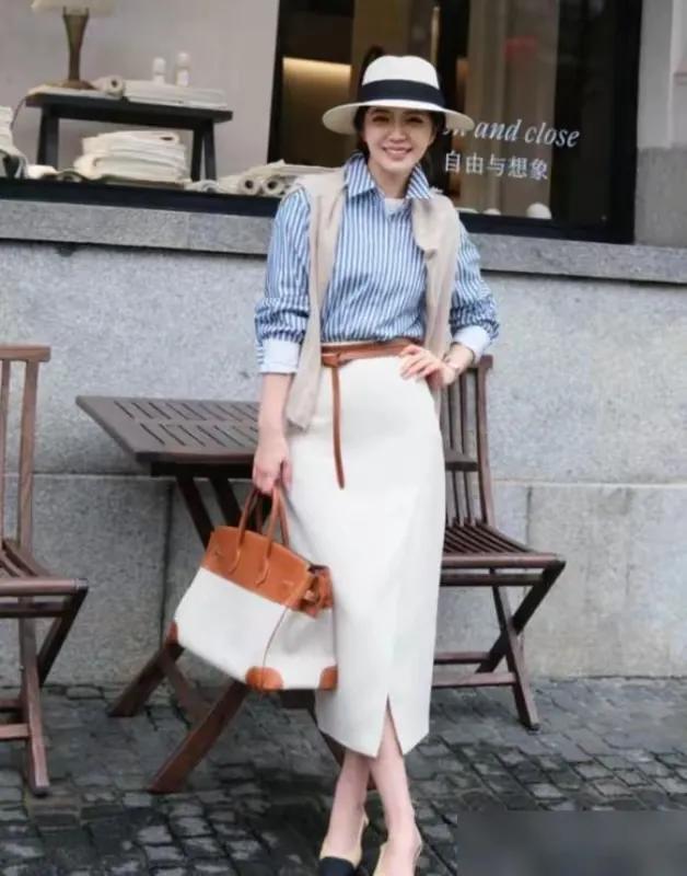 让自己的创意打扮成个性的情况下,我们可以用叠加的穿搭方式,蓝白条纹衬衫叠加一件白色T恤,下半身选择白色的开叉半身裙,脚踩一双拼接色的浅口单鞋,散发出来的气质很有女神范。