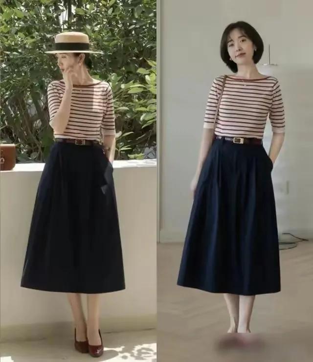 如果你觉得真的整套穿衣打扮过于单调的情况下,我们可以选择天生就拥有时尚元素的条纹针织短袖,搭配上黑色的半身裙或者是藏蓝色的半身裙就够,再加上一款草帽,氛围感直接拉满。